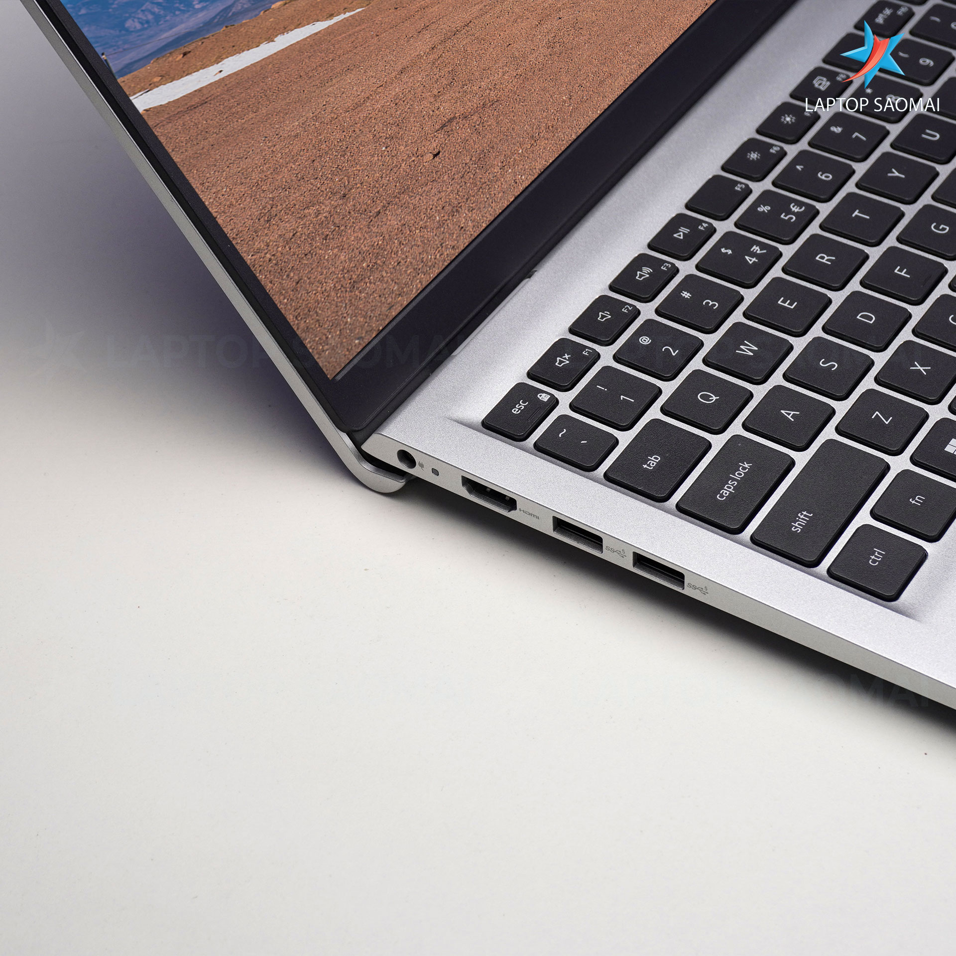 Phía bên trái bao gồm: Bộ chuyển đổi AC, HDMI 1.4, 2x USB-A 3.2, cạnh bên phải gồm: đầu đọc thẻ SD, USB-A 2.0, âm thanh kết hợp 3,5 mm